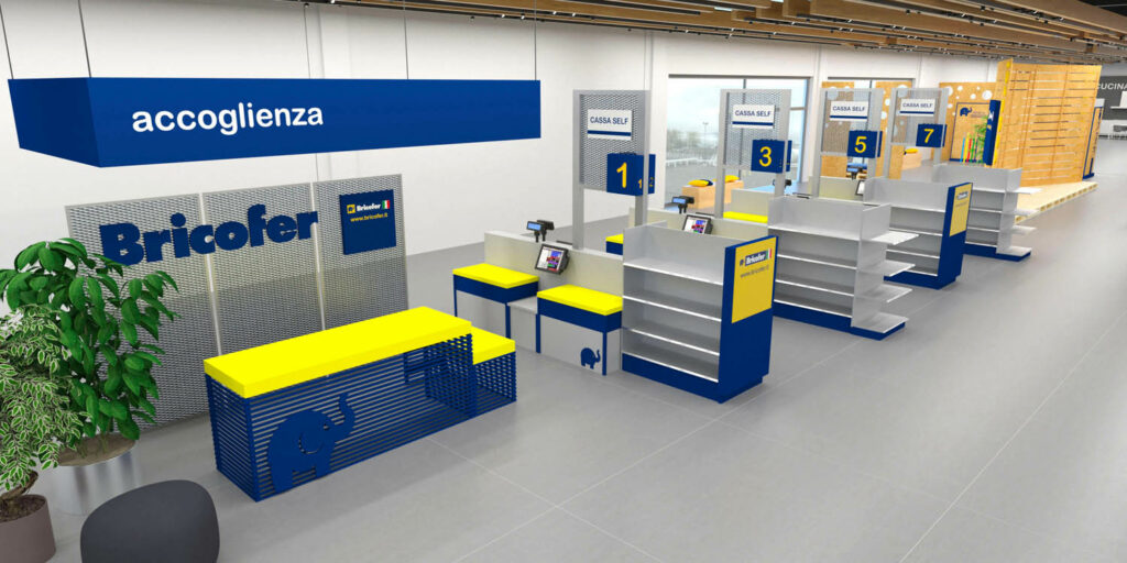 Progettazione spazi interni, riorganizzazione degli spazi espositivi e simulazioni fotorealistiche di un store Bricofer.